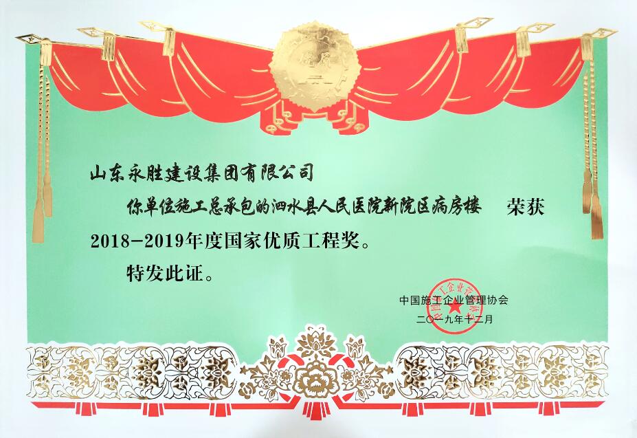 我公司承建的泗水縣人民醫(yī)院新院區(qū)病房樓榮獲2019年度國家優(yōu)質(zhì)工程獎(jiǎng),為濟(jì)寧市唯一一家獲此殊榮的本土企業(yè)。